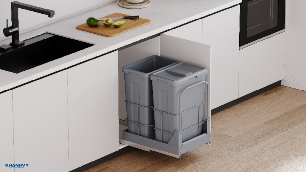 Thùng rác Eurogold bao gồm thùng rác gắn cánh và thùng rác âm tủ, là phụ kiện tủ bếp tiện lợi giúp không gian gọn gàng, kín đáo và vệ sinh. Sản phẩm thường làm từ nhựa cao cấp, có nắp kín, ray kéo giảm chấn, giúp kéo ra/lui êm ái, ngăn mùi và hạn chế bụi bẩn. Thiết kế âm tủ hoặc gắn cánh giúp thùng rác được giấu khéo léo, tiết kiệm không gian, phù hợp với nhiều loại tủ bếp.