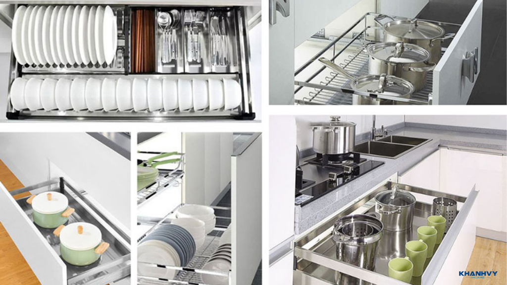 - Trải nghiệm sử dụng mượt mà: Nhiều mẫu phụ kiện được tích hợp ray giảm chấn, cơ chế trượt êm ái, hạn chế tiếng ồn khi đóng mở. Một số sản phẩm còn có khay hứng nước hoặc ngăn chia tiện lợi.