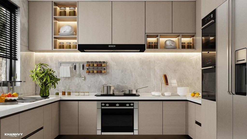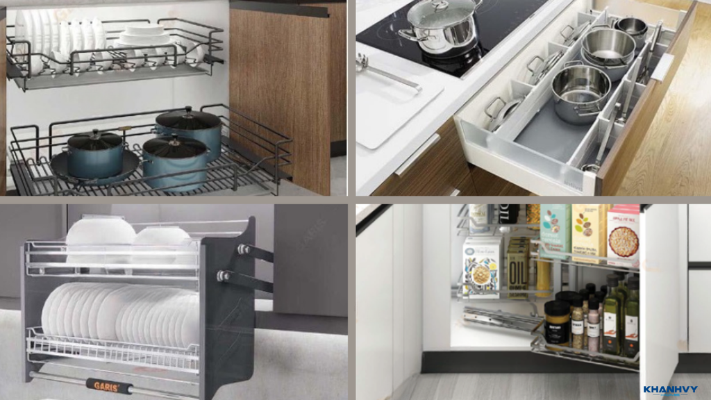 - Phụ kiện tủ bếp thông minh: giá bát đĩa, kệ gia vị, giá xoong nồi, thùng gạo, thùng rác, ray trượt giảm chấn, bản lề… giúp tối ưu không gian và nâng cao trải nghiệm sử dụng.