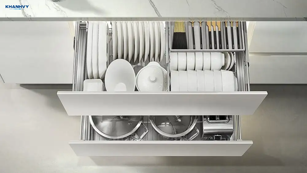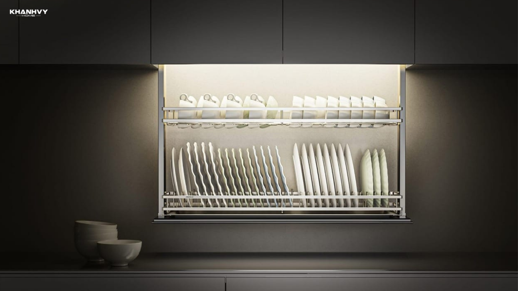 Một số dòng còn tích hợp khay hứng nước, giúp chén dĩa sau khi rửa ráo nước nhanh chóng mà không làm bẩn tủ. Kệ chén dĩa Higold không chỉ giữ căn bếp gọn gàng, sạch sẽ mà còn bảo vệ chén dĩa khỏi va đập, đồng thời nâng cao thẩm mỹ và hiện đại cho không gian bếp.