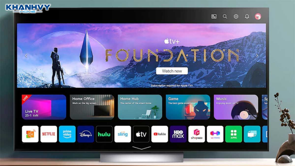 WebOS là hệ điều hành do LG phát triển. Điểm mạnh của WebOS là giao diện thanh điều hướng dạng thanh ngang, thao tác nhanh chóng, hỗ trợ truy cập các ứng dụng phổ biến, lướt web, kết nối thiết bị ngoại vi và điều khiển bằng giọng nói thông minh.
