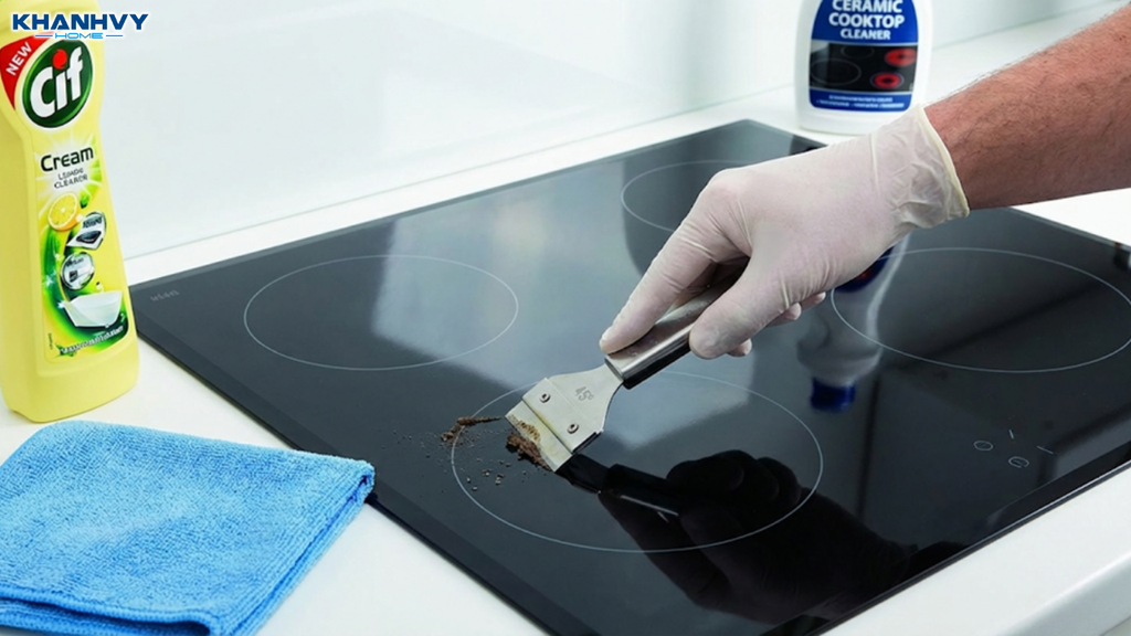Để duy trì độ bền và vẻ đẹp của kính, người dùng nên vệ sinh bếp ngay sau khi nấu xong và mặt bếp đã nguội bớt (chỉ còn ấm). Sử dụng khăn mềm ẩm và dung dịch vệ sinh kính chuyên dụng (như Cif hoặc dung dịch tẩy rửa bếp từ). Tuyệt đối không sử dụng miếng cọ rửa bằng kim loại hoặc vật sắc nhọn để cạo vết bẩn cứng đầu, thay vào đó hãy dùng dao cạo vệ sinh mặt kính chuyên dụng với góc nghiêng phù hợp.