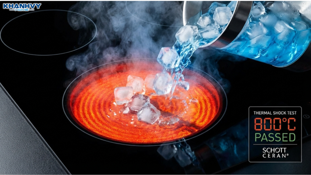 Loại kính này sở hữu khả năng chịu nhiệt lên đến 1000°C và chịu sốc nhiệt đột ngột lên tới 750°C - 800°C. Điều này đồng nghĩa với việc người dùng có thể đổ nước đá trực tiếp lên mặt kính đang nóng đỏ mà không xảy ra hiện tượng nứt vỡ. Khả năng chịu lực nén của Schott Ceran cũng rất ấn tượng, có thể chịu được trọng lượng lên đến 15kg.