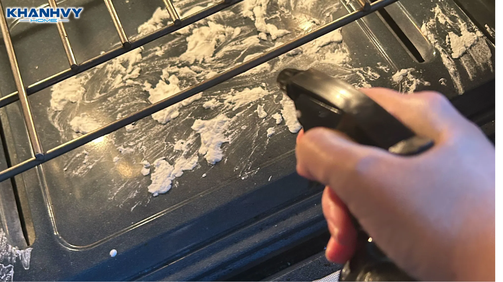 Sau đó, cho 100–150ml giấm trắng vào bình xịt, xịt đều bên trong lò. Khi giấm gặp baking soda còn sót lại sẽ sủi bọt, giúp bong mảng bẩn và khử mùi hiệu quả.