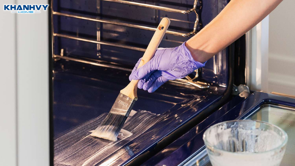 Dùng găng tay cao su để bôi trực tiếp bằng tay, hoặc dùng khăn mềm/miếng mút rửa chén để thoa đều hỗn hợp baking soda lên thành lò, đáy lò và các góc khuất nhiều dầu mỡ.