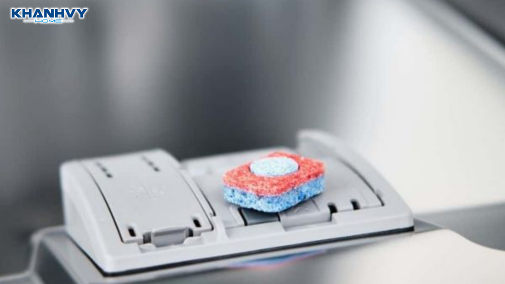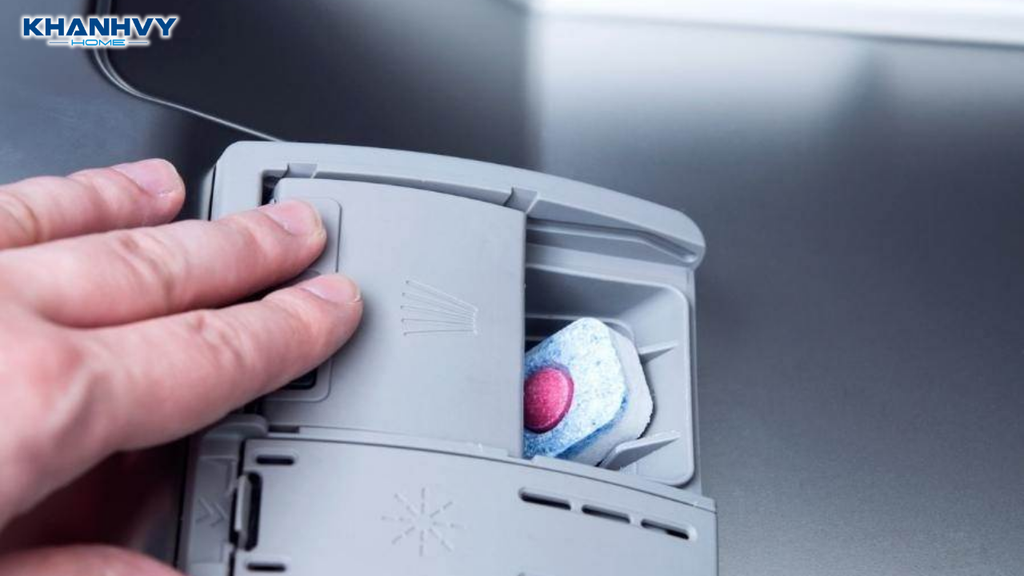 Viên rửa bát cần được đặt đúng vào ngăn chứa chuyên dụng của máy. Nếu đặt sai vị trí hoặc bỏ trực tiếp vào khoang rửa không đúng cách, thời điểm hòa tan có thể bị lệch.