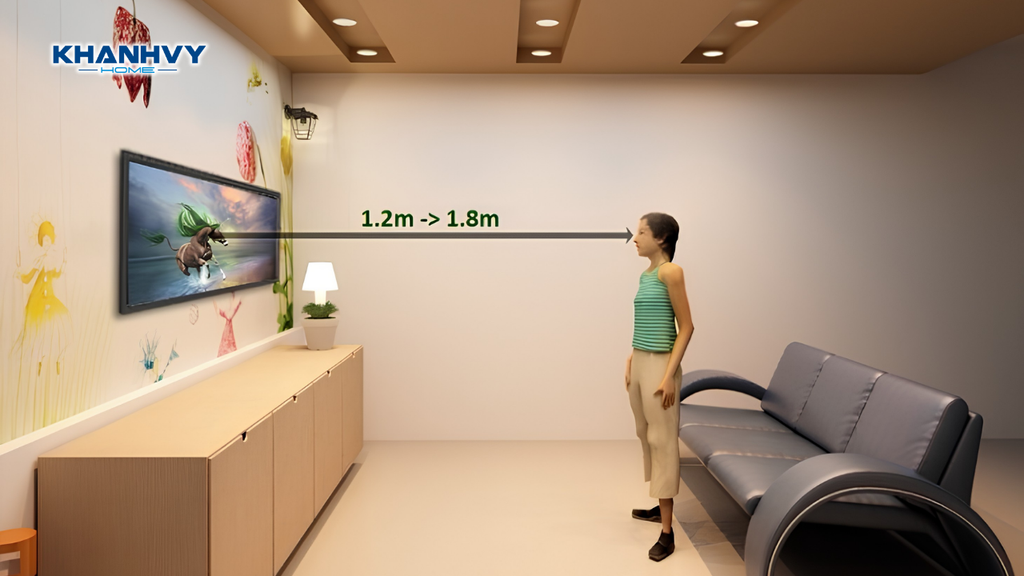 - Khoảng cách xem phù hợp: nên ngồi cách màn hình khoảng 1.5 - 2.5 lần kích thước tivi vì khoảng cách hợp lý giúp hình ảnh dễ nhìn và không gây mỏi mắt.