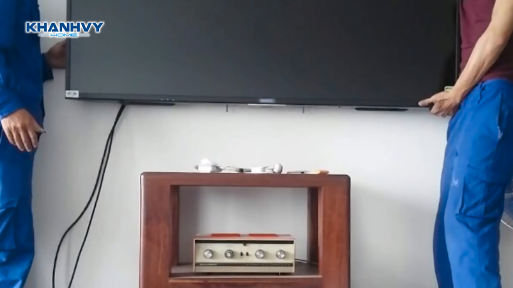 Sau khi phần giá đỡ đã được lắp hoàn chỉnh, người dùng gắn bộ phận treo vào mặt sau tivi rồi đưa tivi lên khung theo đúng khớp nối. Với một số mẫu treo sát tường, nên cắm sẵn dây nguồn hoặc HDMI trước khi hoàn thiện để thao tác thuận tiện hơn.