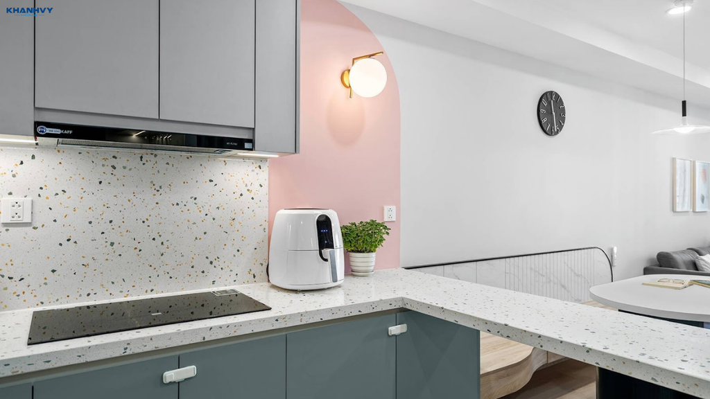 Bếp từ đôi là lựa chọn phổ biến cho chung cư vì đáp ứng đủ nhu cầu nấu ăn hàng ngày mà vẫn gọn gàng. Kích thước bếp cần phù hợp với mặt đá và khoang tủ để đảm bảo lắp đặt âm thẩm mỹ. Với căn hộ nhỏ, thiết kế bếp gọn sẽ giúp không gian bếp thông thoáng hơn.
