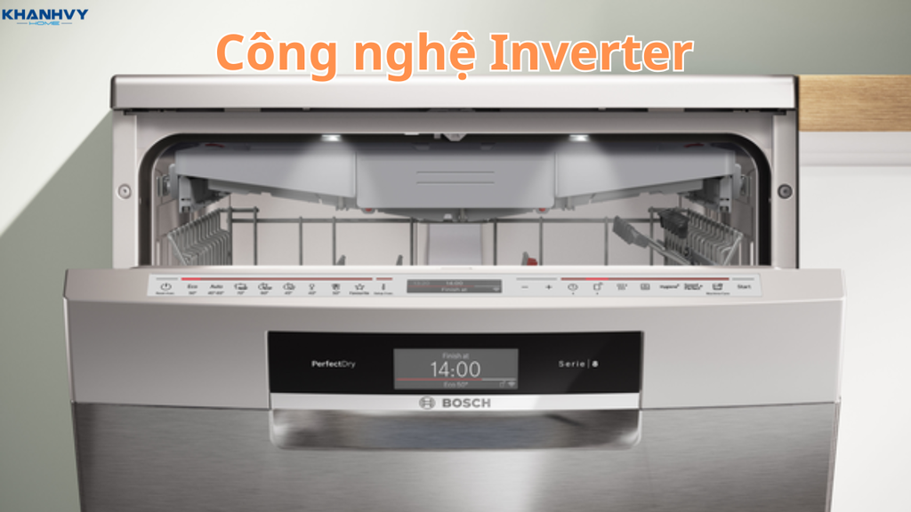 Công nghệ Inverter giúp máy điều chỉnh công suất động cơ linh hoạt theo lượng bát đĩa và độ bẩn thực tế, thay vì luôn chạy ở mức tối đa. Nhờ đó, máy giảm hao phí điện năng, vận hành êm ái hơn và tăng độ bền linh kiện.