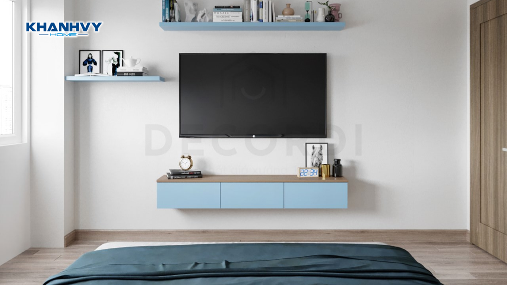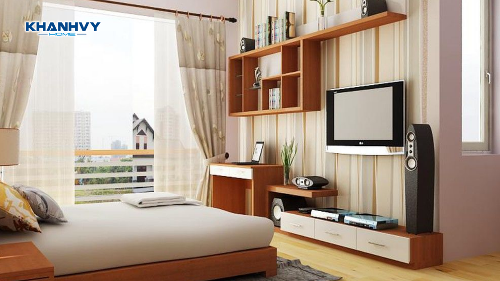 Treo tivi lên tường là cách đơn giản để dọn sạch mặt sàn, tạo tầm nhìn thoáng hơn và làm không gian trông gọn gàng, tối ưu cho phòng ngủ nhỏ