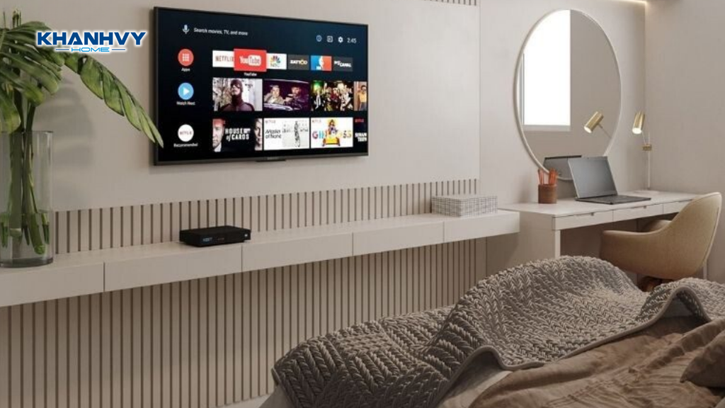 Khi bạn chọn được tivi phù hợp kích thước và tính năng, thiết bị giúp bạn truy cập các ứng dụng giải trí trực tuyến một cách dễ dàng mà không cần thêm thiết bị phụ trợ, đồng thời tạo ra không gian tiện nghi và vừa vặn với phòng ngủ.
