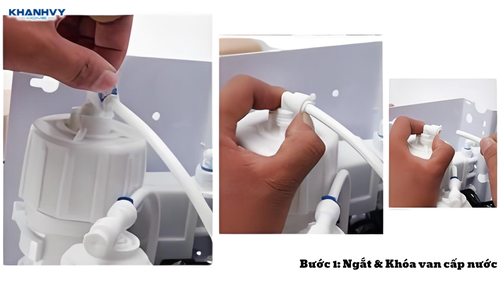 - Khóa van cấp nước, ngắt điện máy lọc để đảm bảo an toàn khi thao tác