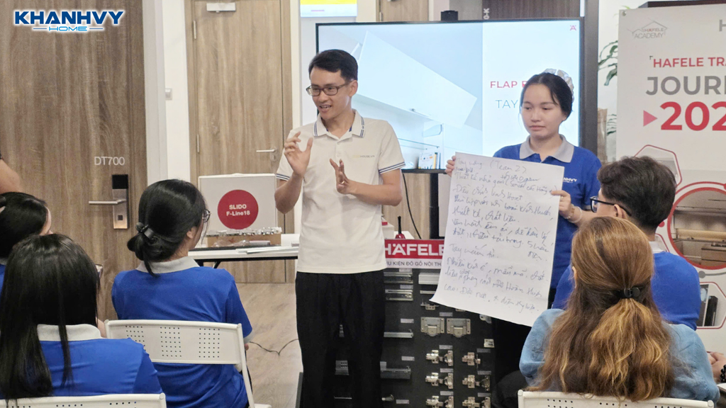 Ngoài ra, chương trình còn góp phần nâng cao tư duy làm việc theo hướng chuyên nghiệp và bài bản. Việc tiếp cận với quy trình đào tạo từ Hafele giúp định hình rõ hơn cách triển khai công việc một cách logic, đồng bộ từ khâu lựa chọn sản phẩm đến ứng dụng thực tế.