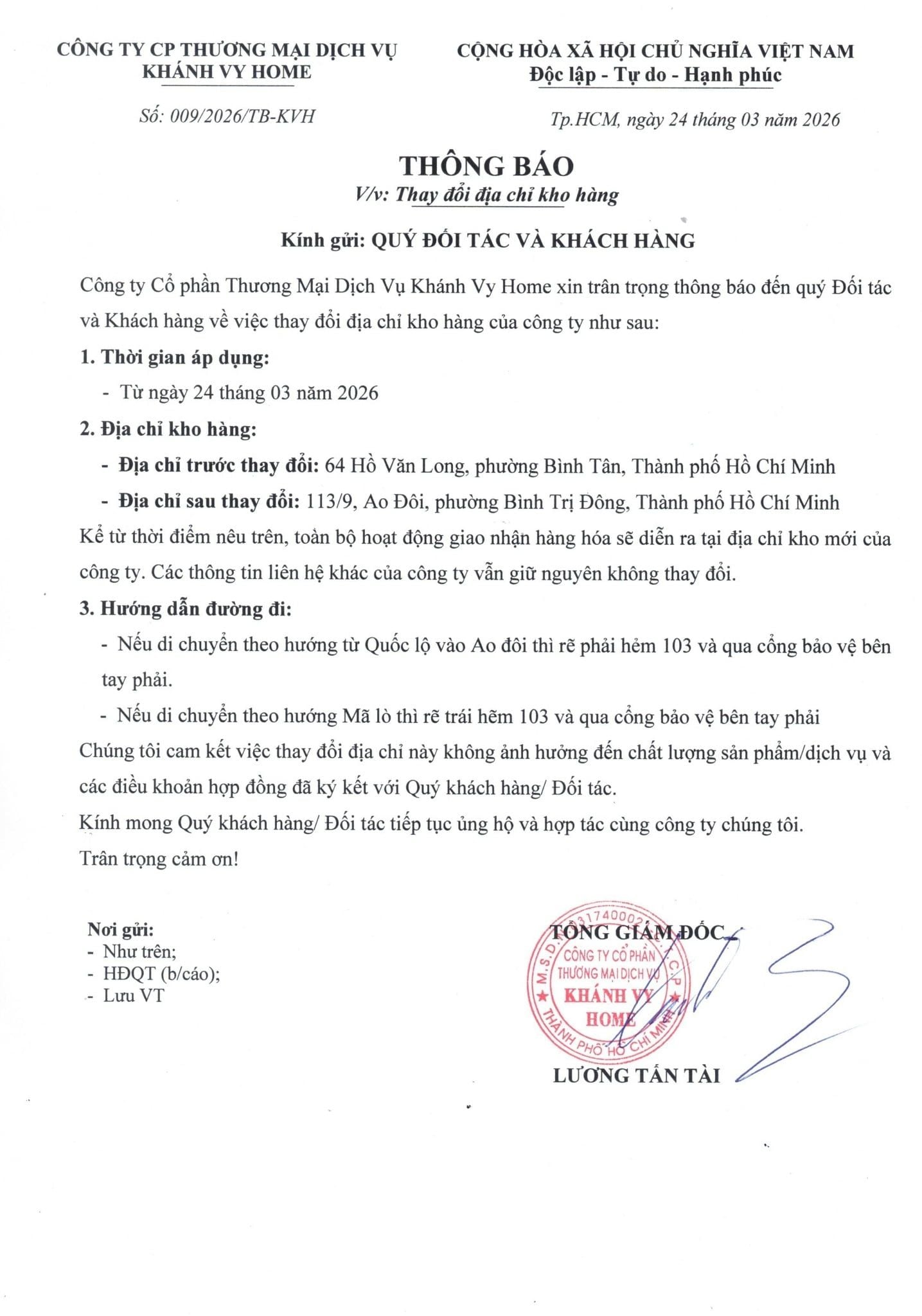 Đánh giá THÔNG BÁO V/v: Thay đổi địa chỉ kho hàng