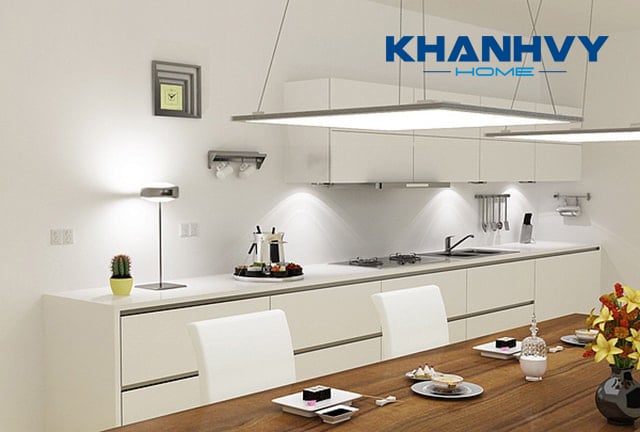 Ngoài ra, hãy thiết kế hệ thống chiếu sáng sao cho nhìn rõ được mọi vật dụng, dễ dàng cho việc nấu nướng. Bạn có thể lắp đặt thêm đèn led tại phía dưới của tủ bếp trên để chiếu sáng khu vực bàn bếp. Giúp việc nấu nướng, cắt thái và sơ chế thực phẩm trở nên dễ dàng hơn.