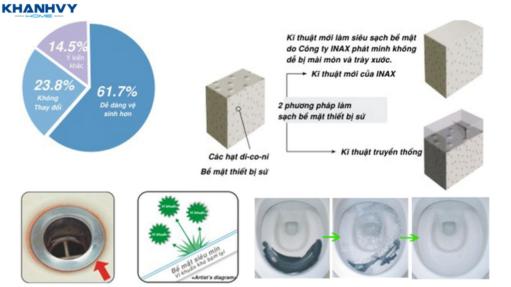 Công nghệ chống bám bẩn Aqua Ceramic của Inax giúp đánh bay vết bẩn dễ dàng, duy trì vẻ trắng sáng cho sản phẩm