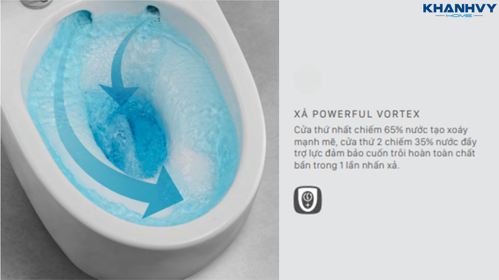 3. Xả xoáy Vortex: Công nghệ xả mạnh mẽ, cuốn trôi mọi vết bẩn trong một lần nhấn xả, vận hành êm ái.