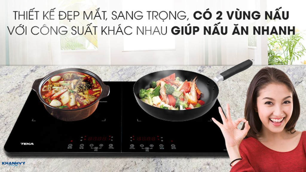 Đây là dòng sản phẩm phổ biến nhất của Teka, phù hợp với đa số gia đình Việt Nam. Hai vùng nấu độc lập cho phép người dùng nấu cùng lúc nhiều món ăn, tiết kiệm thời gian và điện năng. Các mẫu bếp hai vùng thường có công suất tổng từ 3.5–6.0 kW, tích hợp công nghệ Booster giúp tăng tốc đun nấu nhanh chóng. Mặt kính Schott Ceran cao cấp kết hợp bảng điều khiển cảm ứng trượt mang lại trải nghiệm thao tác nhạy bén, hiện đại.