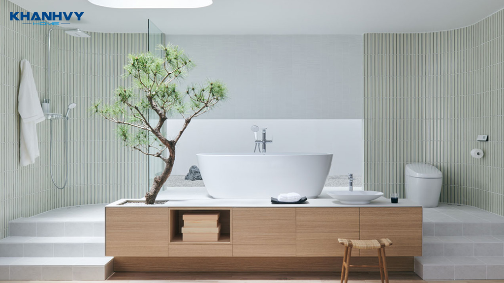 Kiểu lắp đặt này cân bằng giữa tính tiện dụng và vẻ đẹp trang nhã, phù hợp với phòng tắm có diện tích trung bình, nơi chủ nhà muốn vừa tiết kiệm diện tích vừa giữ được nét hiện đại.