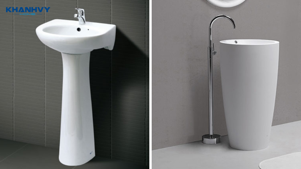 Kiểu lavabo chân dài có chân đỡ cao hơn, trụ thẳng xuống sàn, mang lại vẻ đẹp cổ điển hoặc tân cổ điển cho phòng tắm.