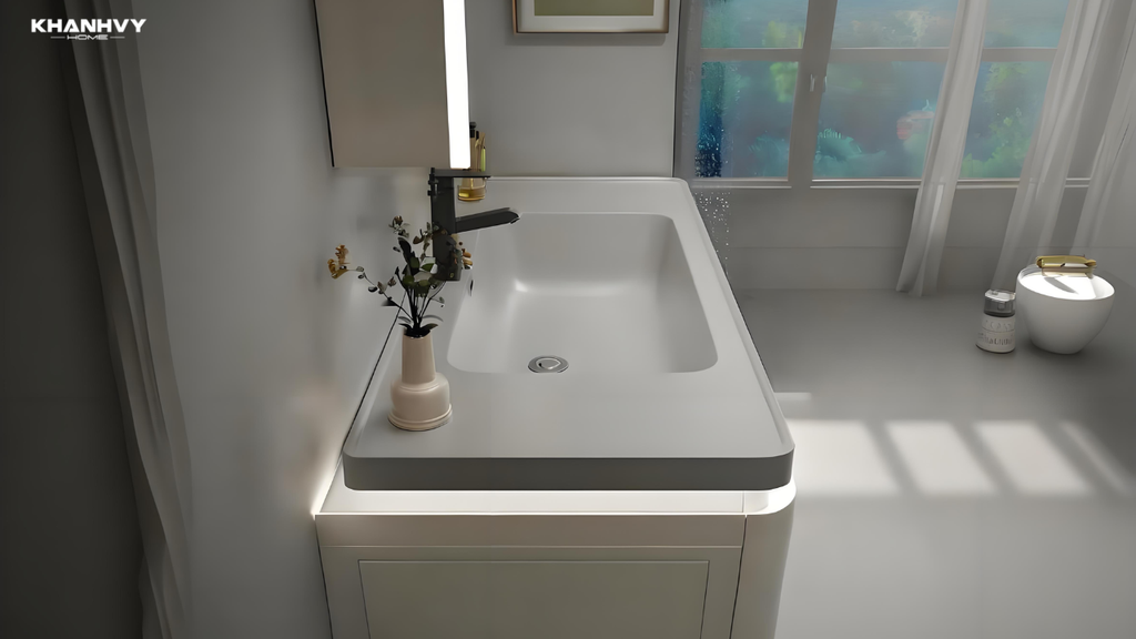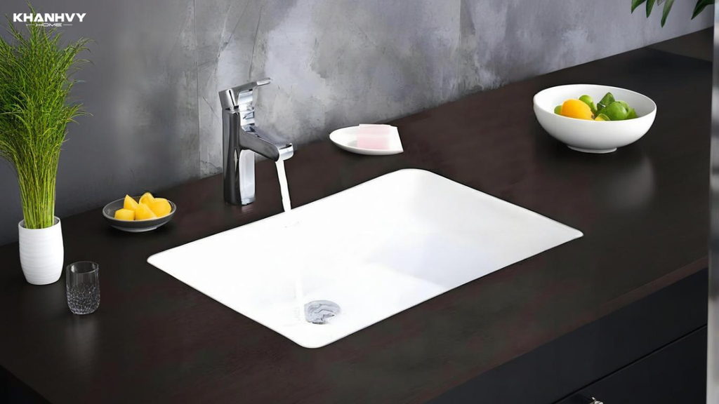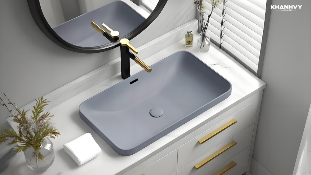 Composite, đá nhân tạo | Trọng lượng nhẹ hơn sứ, khả năng tạo nhiều kiểu dáng khác nhau, khả năng chịu lực va đập có thể tốt hơn nếu làm đúng tiêu chuẩn. | Giá cao hơn; nếu bị xước hoặc nứt sẽ khó sửa; khả năng bền màu có thể thấp hơn khi tiếp xúc hóa chất mạnh hoặc nhiệt độ cao. |