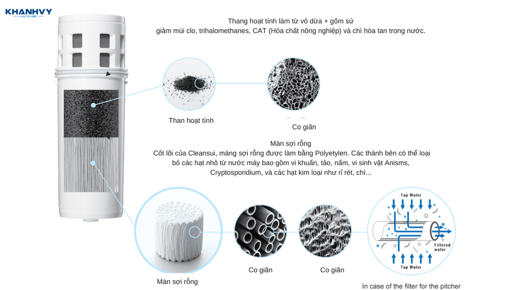 Cleansui thiết kế nhiều loại lõi khác nhau, mỗi loại đảm nhận một nhiệm vụ riêng: