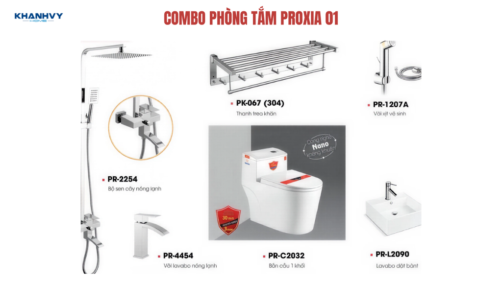 Nếu bạn vẫn còn băn khoăn chưa biết nên chọn combo phòng tắm Proxia nào phù hợp, thì ngay dưới đây Khánh Vy Home sẽ tổng hợp và review chi tiết từng combo để bạn dễ dàng đưa ra quyết định.