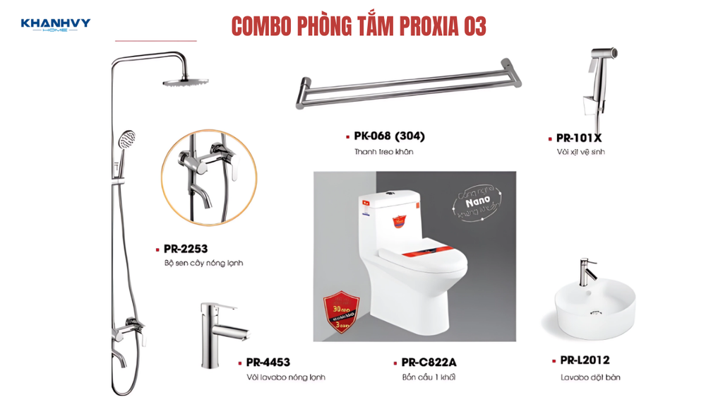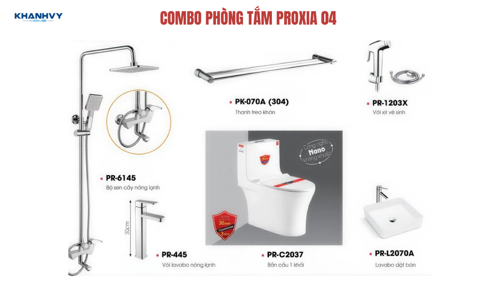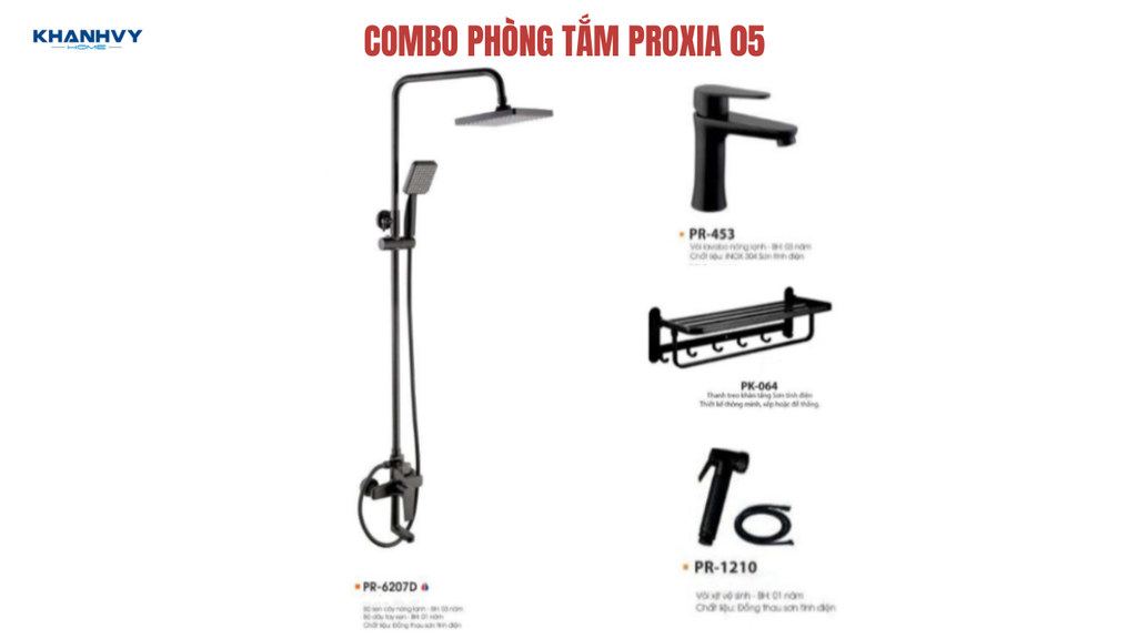 Các sản phẩm của Proxia nổi bật với độ bền vượt trội, chẳng hạn như bồn cầu sứ chống ố vàng, lavabo men bóng chống bám bẩn hay vòi sen inox chống gỉ sét, vừa dễ vệ sinh vừa giữ được vẻ đẹp lâu dài. Chính vì vậy, khi lựa chọn combo phòng tắm Proxia tại Khánh Vy Home, khách hàng không chỉ được sở hữu trọn bộ thiết bị vệ sinh đồng bộ, tiết kiệm chi phí hơn so với mua lẻ mà còn yên tâm về chất lượng, chế độ bảo hành và dịch vụ lắp đặt chuyên nghiệp, mang lại một không gian phòng tắm tiện nghi, hiện đại và sang trọng.