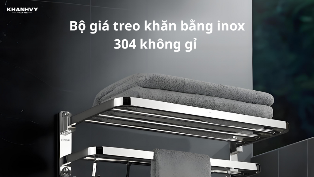 Thanh vắt khăn 2 tầng | Inox 304 hoặc hợp kim cao cấp | Chống gỉ sét, bền bỉ, thiết kế hai tầng giúp treo được nhiều khăn, tối ưu không gian. |