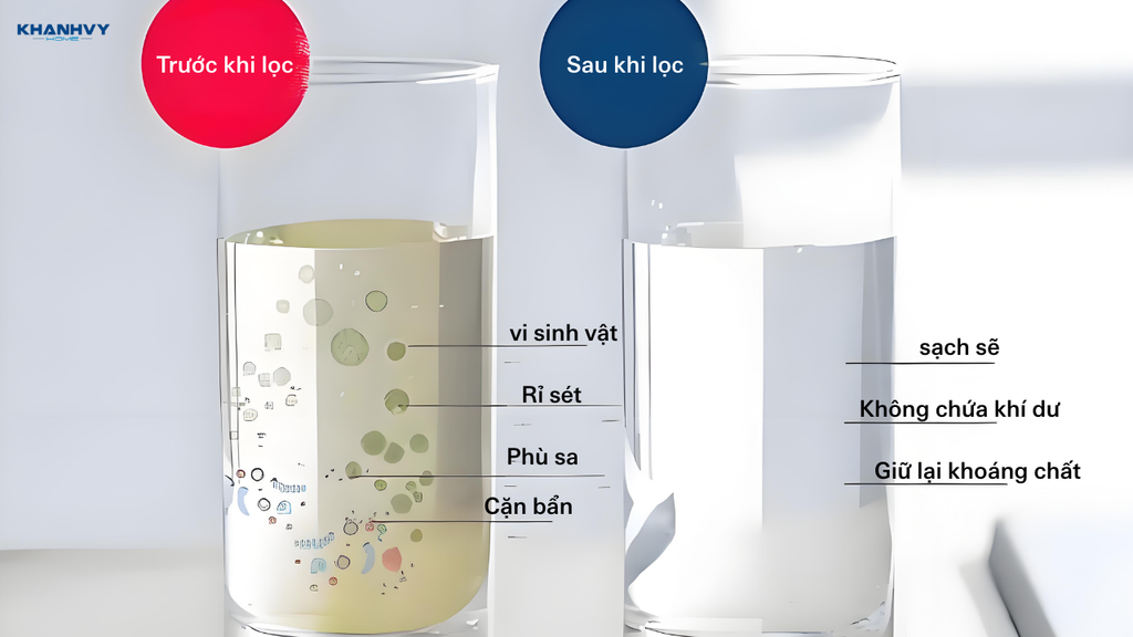 Chất lượng nước sau lọc | Loại bỏ vi khuẩn, cặn bẩn | Loại bỏ vi khuẩn, virus, kim loại nặng, giữ khoáng chất |