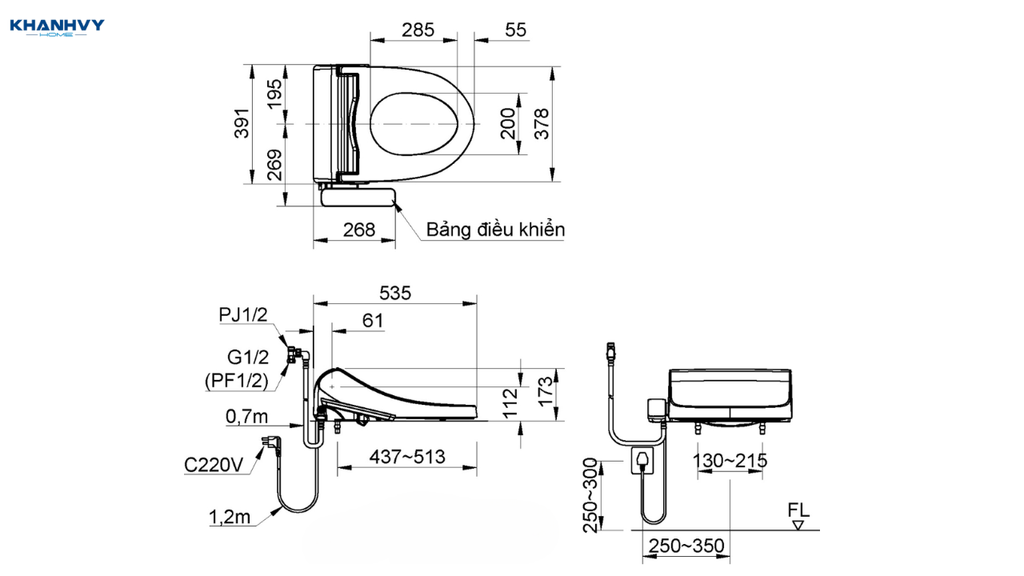 Kích thước nắp bồn cầu điện tử tiêu chuẩn: