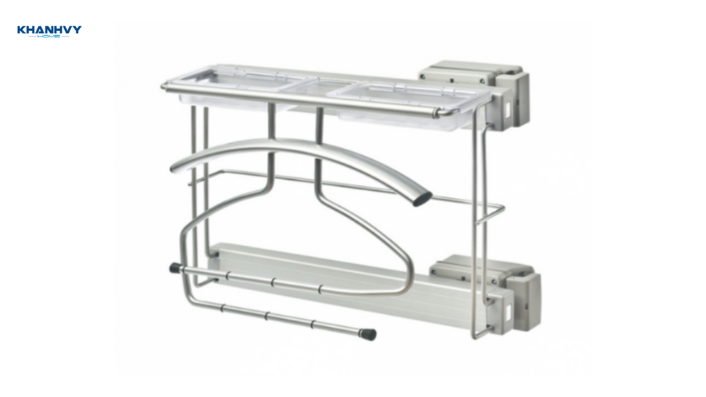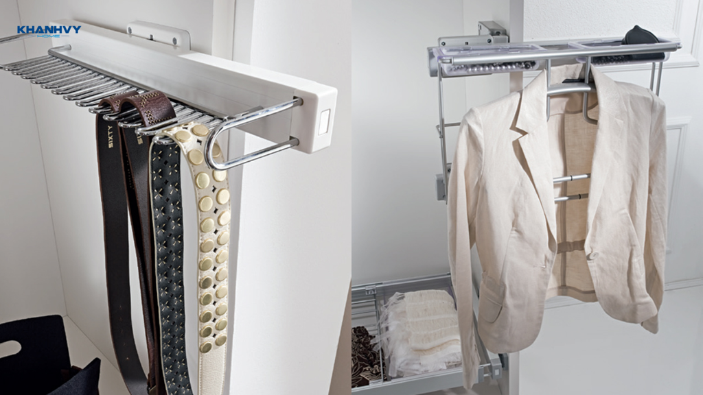 Khung kéo có giá treo là một loại phụ kiện được thiết kế chuyên biệt để sắp xếp các món phụ kiện nhỏ như thắt lưng, cà vạt, khăn quàng cổ hay áo vest một cách ngăn nắp, tiện lợi, bạn có thể dễ dàng tìm thấy chiếc cà vạt yêu thích mà không cần lục tung cả tủ. Các khung này có thể kéo ra ngoài, giúp bạn có thể dễ dàng lựa chọn món phụ kiện phù hợp.