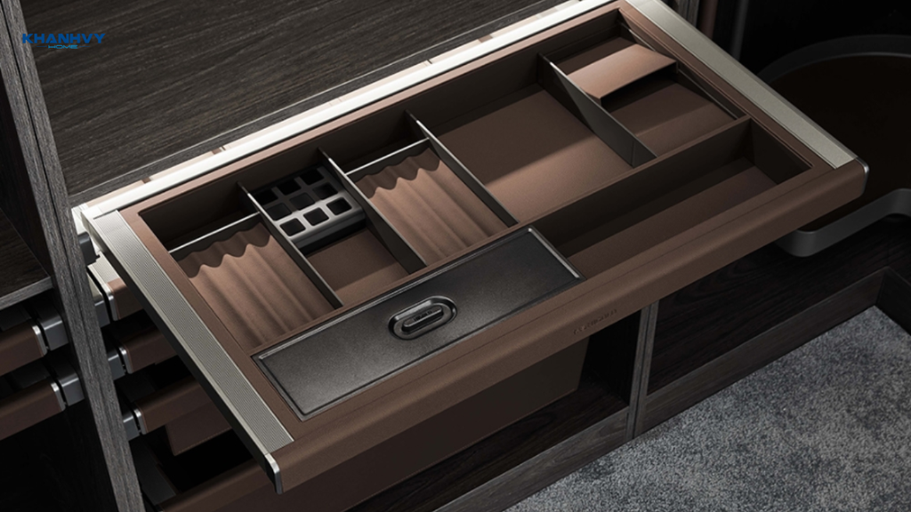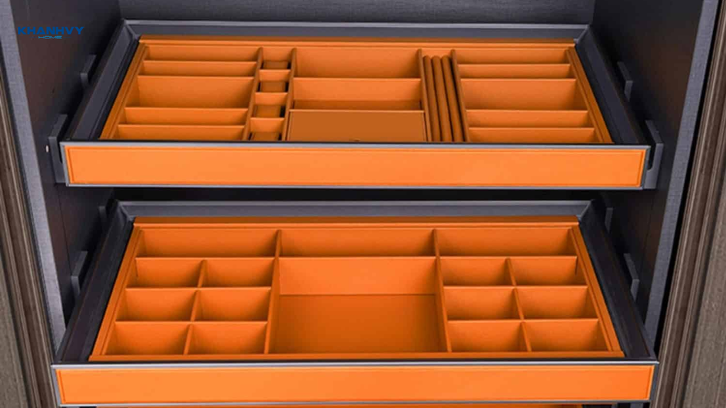 Ngăn kéo chia ngăn là những chiếc ngăn kéo, được trang bị nhiều vách ngăn linh hoạt với kích thước đa dạng, giúp bạn dễ dàng phân loại và sắp xếp các món đồ nhỏ như tất, đồ lót, phụ kiện, nước hoa,... một cách gọn gàng và sạch sẽ, tránh tình trạng bị lẫn lộn với các món đồ khác.