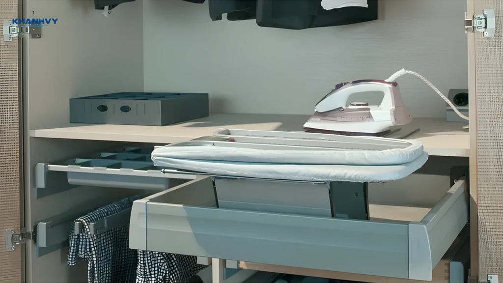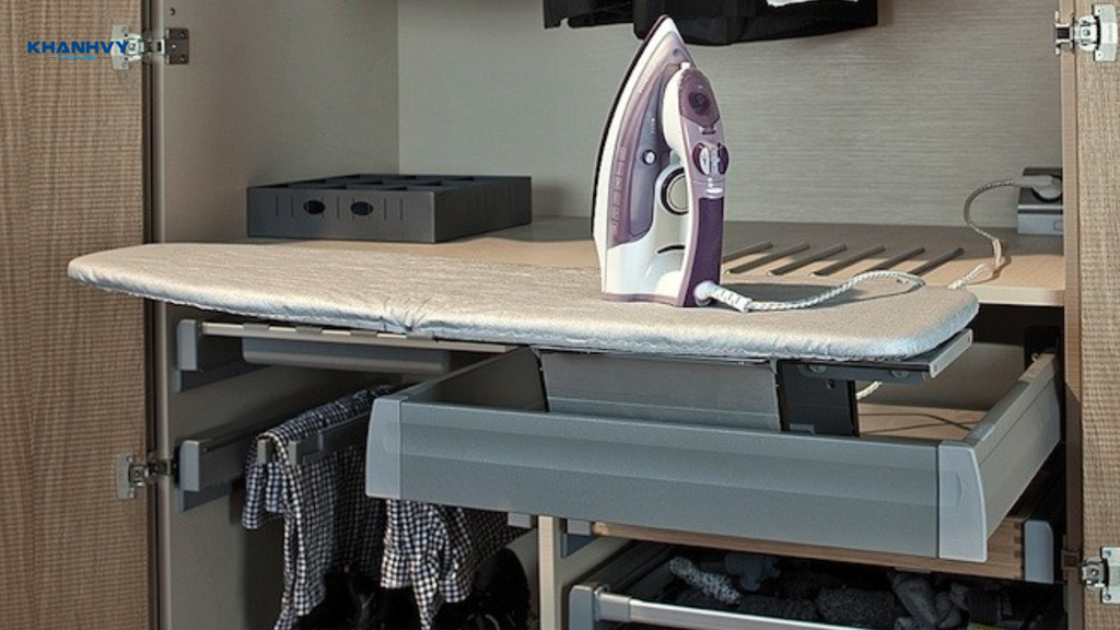 Bàn ủi đồ là một phụ kiện tủ áo vô cùng đa năng và hữu ích. Phụ kiện được thiết kế gọn gàng và gắn vào tủ quần áo, khi cần sử dụng bạn chỉ cần kéo bàn ủi và mở ra. Sau khi sử dụng xong, chỉ cần gấp gọn và đẩy vào trong tủ. Phụ kiện này vô cùng tiết kiệm không gian và tiện lợi so với bàn ủi đồ truyền thống.