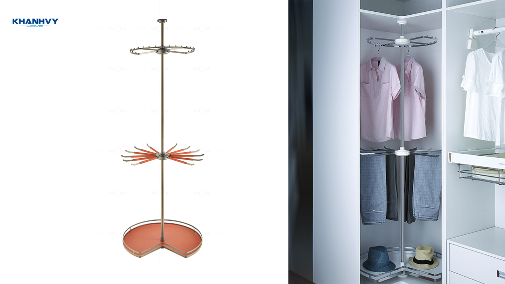 Giá xoay treo góc tủ quần áo là một giải pháp vô cùng thông minh, giúp bạn tận dụng tối đa không gian góc tủ để đựng quần áo, đồ vật. Với thiết kế giá xoay tiện lợi, bạn có thể dễ dàng lấy đồ vật ở góc tủ chỉ bằng cách xoay nhẹ giá treo.