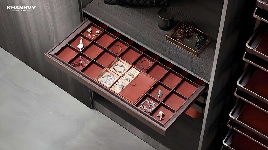 Thiết kế phụ kiện phải thông minh, dễ thao tác và tối ưu không gian. Ví dụ: kệ kéo, kệ xoay, thùng rác âm tủ, ray trượt êm giúp việc sử dụng nhanh chóng và an toàn. Phụ kiện tủ áo như giá treo nâng hạ, kệ gấp nhiều tầng hay giá để đồ trang sức cũng cần thiết kế khoa học để dễ sắp xếp, dễ quan sát và nhanh chóng lấy đồ khi cần.