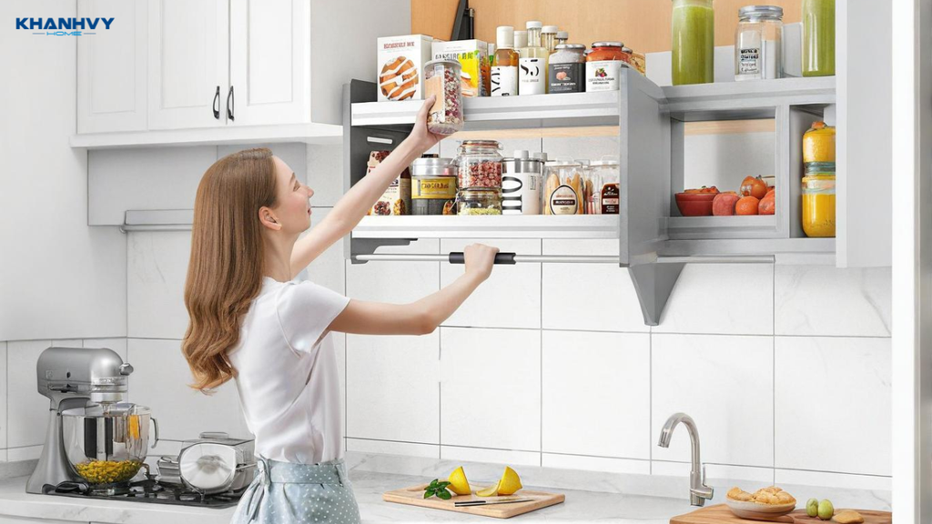 Ngoài các phụ kiện chính, Khánh Vy Home còn cung cấp nhiều giải pháp tiện ích khác như: giá dao đa năng, ray trượt thông minh, móc treo dụng cụ, thùng đựng chai lọ đa năng, hay kệ góc xoay. Các phụ kiện này giúp tận dụng tối đa không gian, tạo sự gọn gàng, tiện nghi và nâng cao tính thẩm mỹ cho căn bếp.