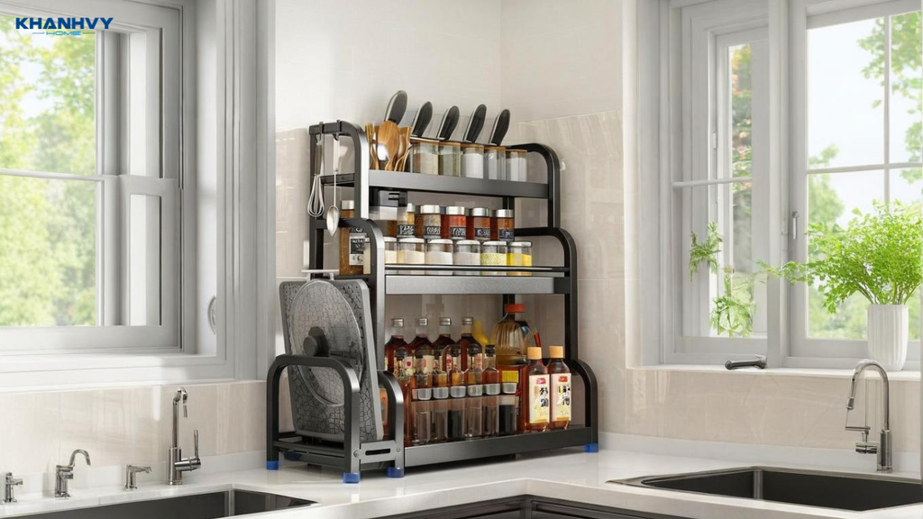 Kệ gia vị giúp căn bếp luôn ngăn nắp và tiện dụng. Thiết kế nhiều ngăn, dễ phân loại các lọ gia vị, chai dầu, hũ muối, đường. Giá thớt có thể gắn bên hông tủ hoặc âm tủ, giúp giữ bề mặt bếp sạch, thao tác nấu nướng nhanh chóng. Một số mẫu tích hợp ray kéo, thuận tiện thao tác và dễ vệ sinh sau khi sử dụng.