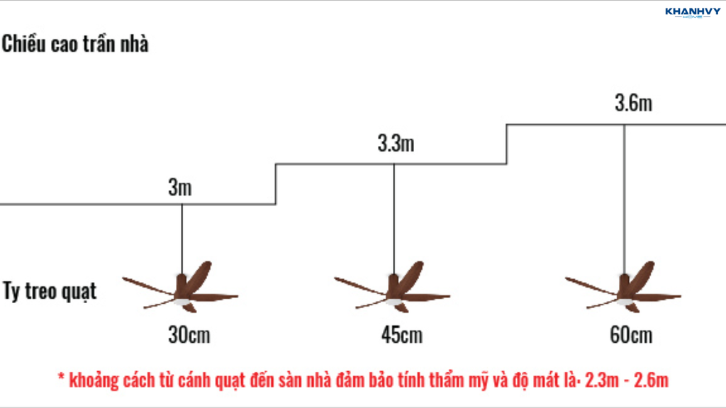 Kích thước cánh quạt phải phù hợp với diện tích phòng và chiều cao trần. Với phòng nhỏ dưới 15m², bạn nên chọn quạt có đường kính từ 1,0m đến 1,2m; phòng từ 15 – 25m² nên chọn quạt từ 1,2m đến 1,4m; còn không gian rộng hơn 25m² thì nên dùng quạt cánh từ 1,5m trở lên. Ngoài ra, từ cánh quạt đến trần nhà nên cao tối thiểu 2,3m để đảm bảo an toàn và khả năng luân chuyển gió. Nếu trần thấp, bạn có thể ưu tiên các mẫu quạt ốp trần hoặc loại có ty ngắn.