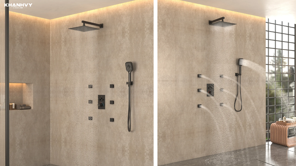 Chế độ phun | Mưa, xịt tập trung | Nhiều chế độ: massage, sương mịn, phun tia xoáy, kết hợp |