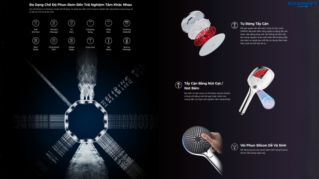 Các chế độ phun và tính năng tẩy cặn của sen tắm Jomoo