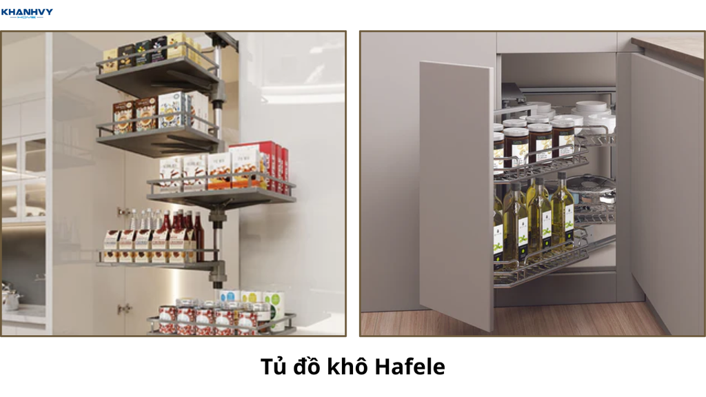Hafele là thương hiệu đến từ Đức, nổi tiếng với các giải pháp lưu trữ thông minh cho nhà bếp. Tủ đồ khô Hafele được thiết kế hiện đại, chất liệu cao cấp như inox và nhựa chịu lực, đảm bảo độ bền và khả năng chống ẩm hiệu quả.