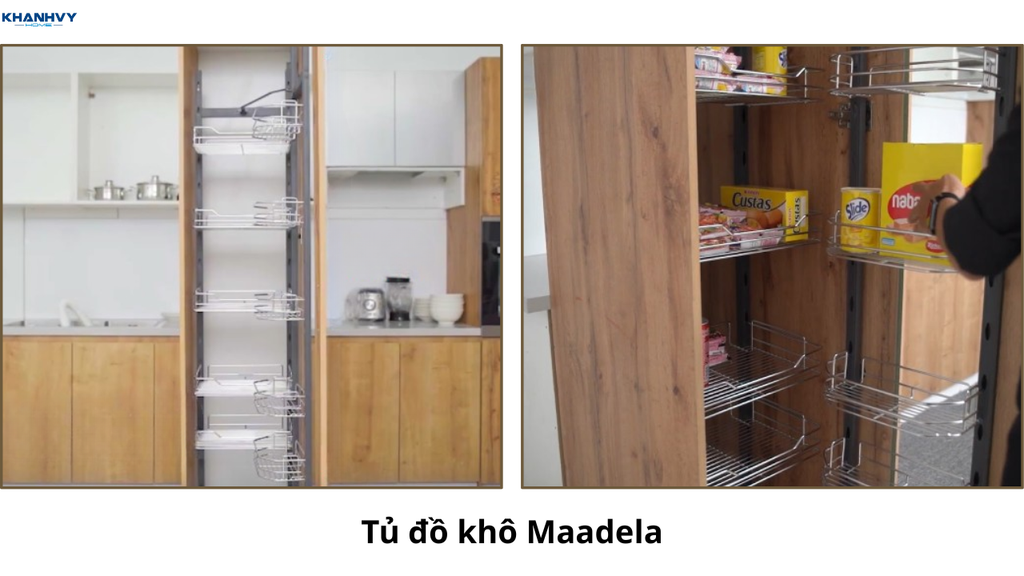 Maadela nổi bật với các sản phẩm tủ bếp thông minh, trong đó có tủ đồ khô. Tủ Maadela thường sử dụng inox cao cấp hoặc gỗ chống ẩm, đảm bảo độ bền lâu dài và vệ sinh dễ dàng.
