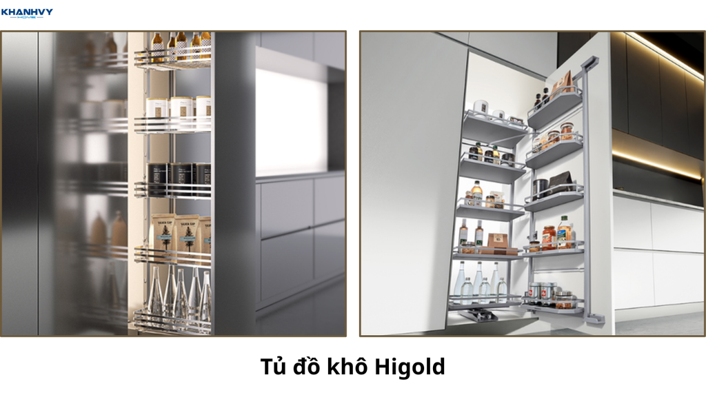 Higold là thương hiệu chuyên về các phụ kiện và tủ bếp cao cấp, trong đó tủ đồ khô cũng được nhiều người lựa chọn. Tủ Higold nổi bật với thiết kế cánh kéo tiện dụng, ray trượt êm ái, chịu lực tốt.