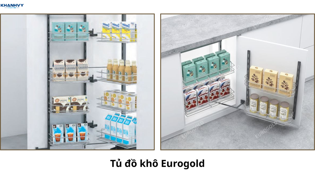 Eurogold cung cấp các giải pháp lưu trữ bếp hiện đại, bao gồm tủ đồ khô với cả cánh mở và cánh kéo. Sản phẩm nổi bật với chất liệu inox 304, chống gỉ, dễ vệ sinh và bền bỉ theo thời gian.