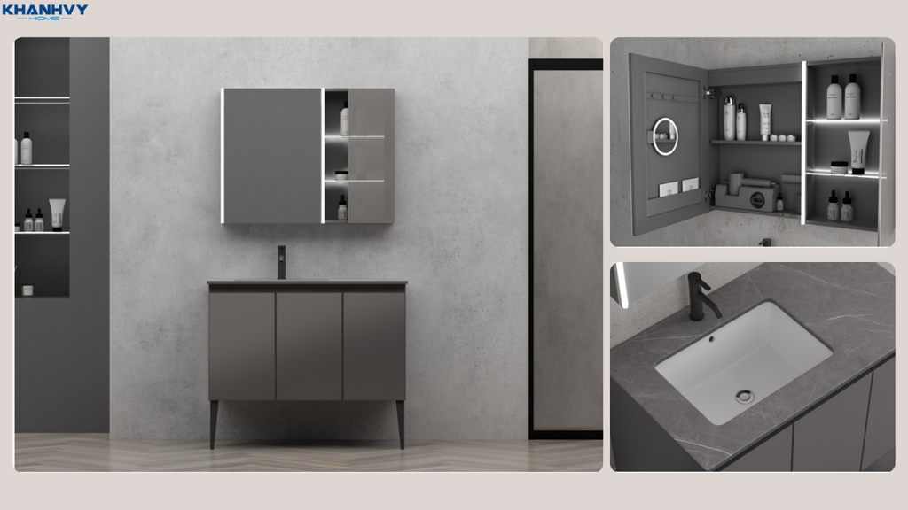 Điểm nhấn của mẫu A2211-12YC-I011 nằm ở sự kết hợp vật liệu độc đáo giữa bề mặt tủ màu xám vân đá và chậu sứ trắng. Thiết kế này mang lại cảm giác sang trọng, gần gũi với thiên nhiên. Tủ được trang bị gương LED cảm ứng thông minh, có chức năng sấy gương chống đọng hơi nước, cực kỳ tiện lợi. Không gian lưu trữ được phân chia khoa học với cả ngăn kéo và hộc tủ có cánh mở.