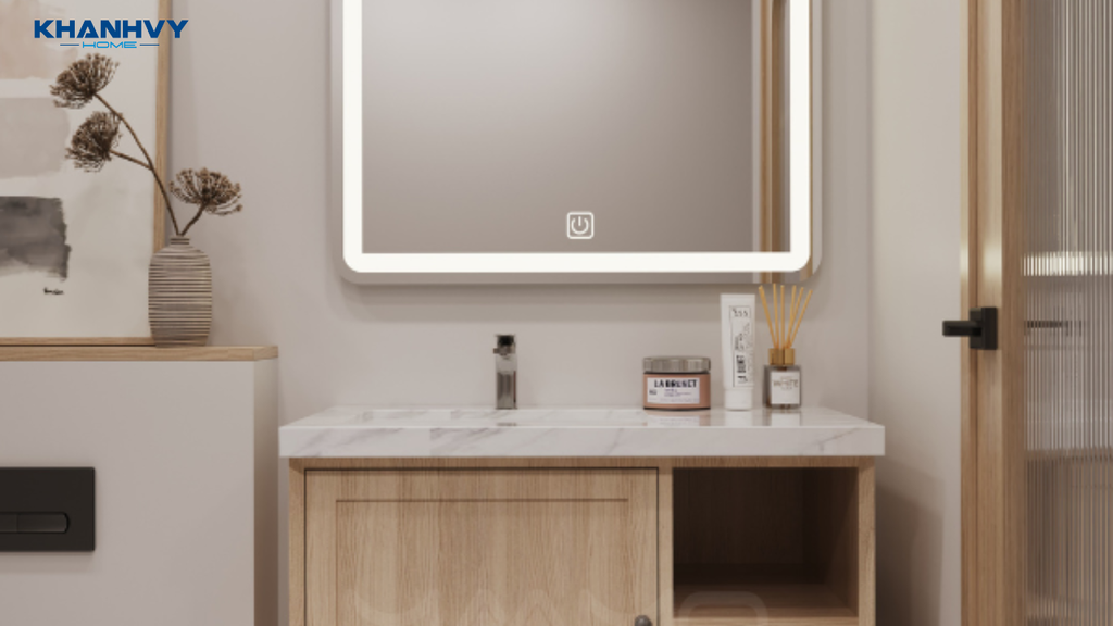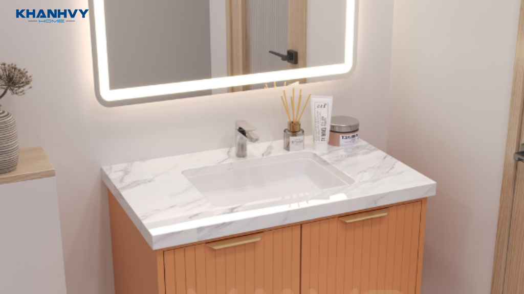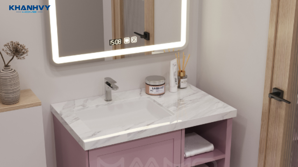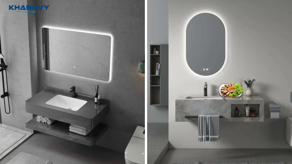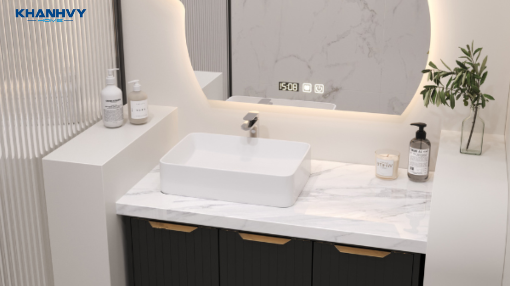 • Hệ thống đèn LED kép: Đèn LED được bố trí ở hai khu vực: xung quanh gương soi và dưới khe viền mặt đá, tạo hiệu ứng ánh sáng hiện đại và tăng tính thẩm mỹ cho phòng tắm.