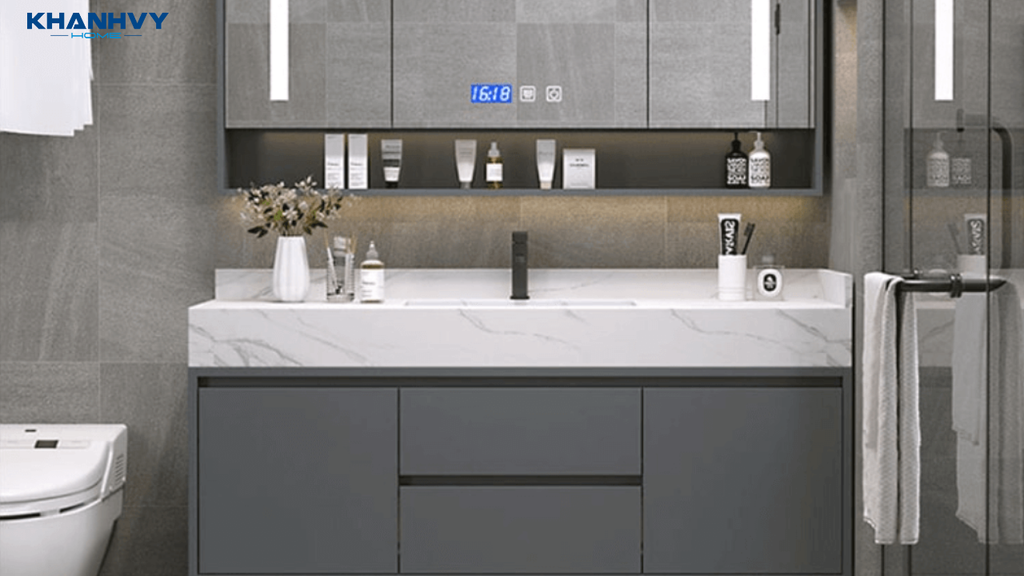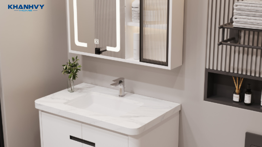 • Ngăn tủ lưu trữ rộng rãi: Giúp sắp xếp đồ dùng phòng tắm gọn gàng, tiện lợi.