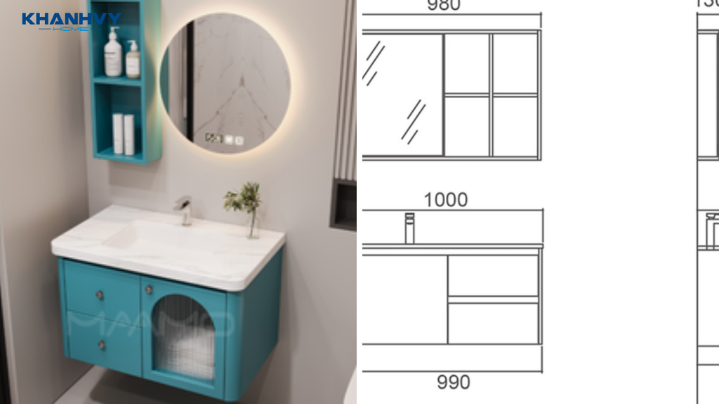 • Chiều cao tủ lavabo thường nằm khoảng từ 800mm đến 900mm (tương đương 80cm - 90cm), phù hợp với chiều cao đứng sử dụng người Việt Nam.